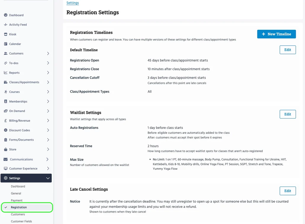 - Registration Settings for Classes/Appointments