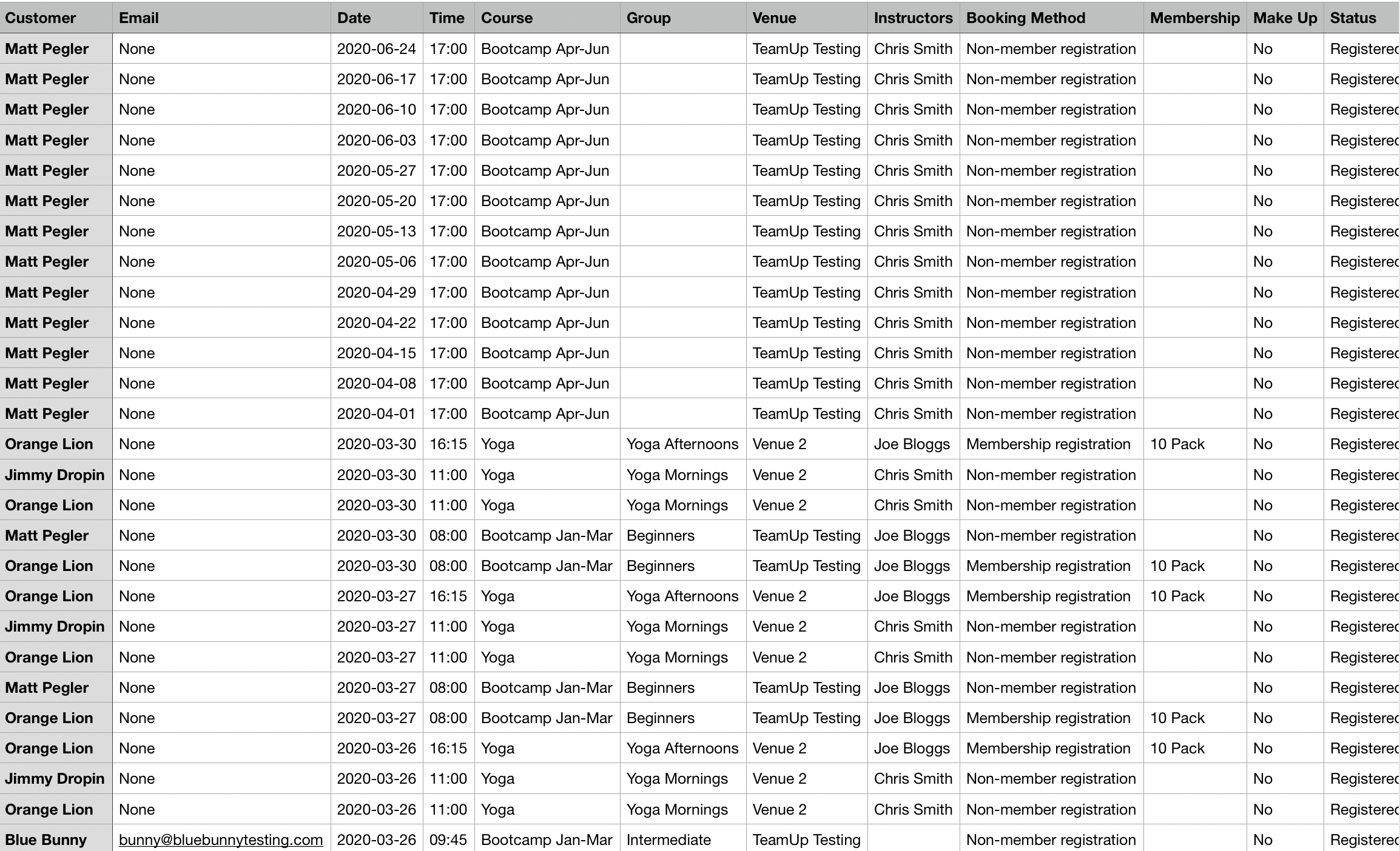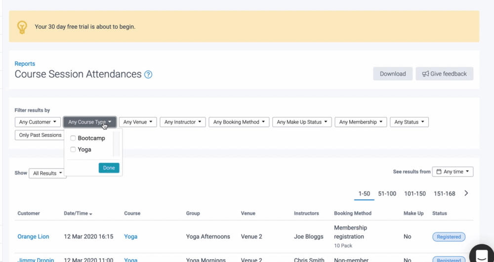 Use filters to narrow down results. For example, you might choose to filter by a specific course type, booking method to exclude drop-in attendances and by status to exclude no-shows.