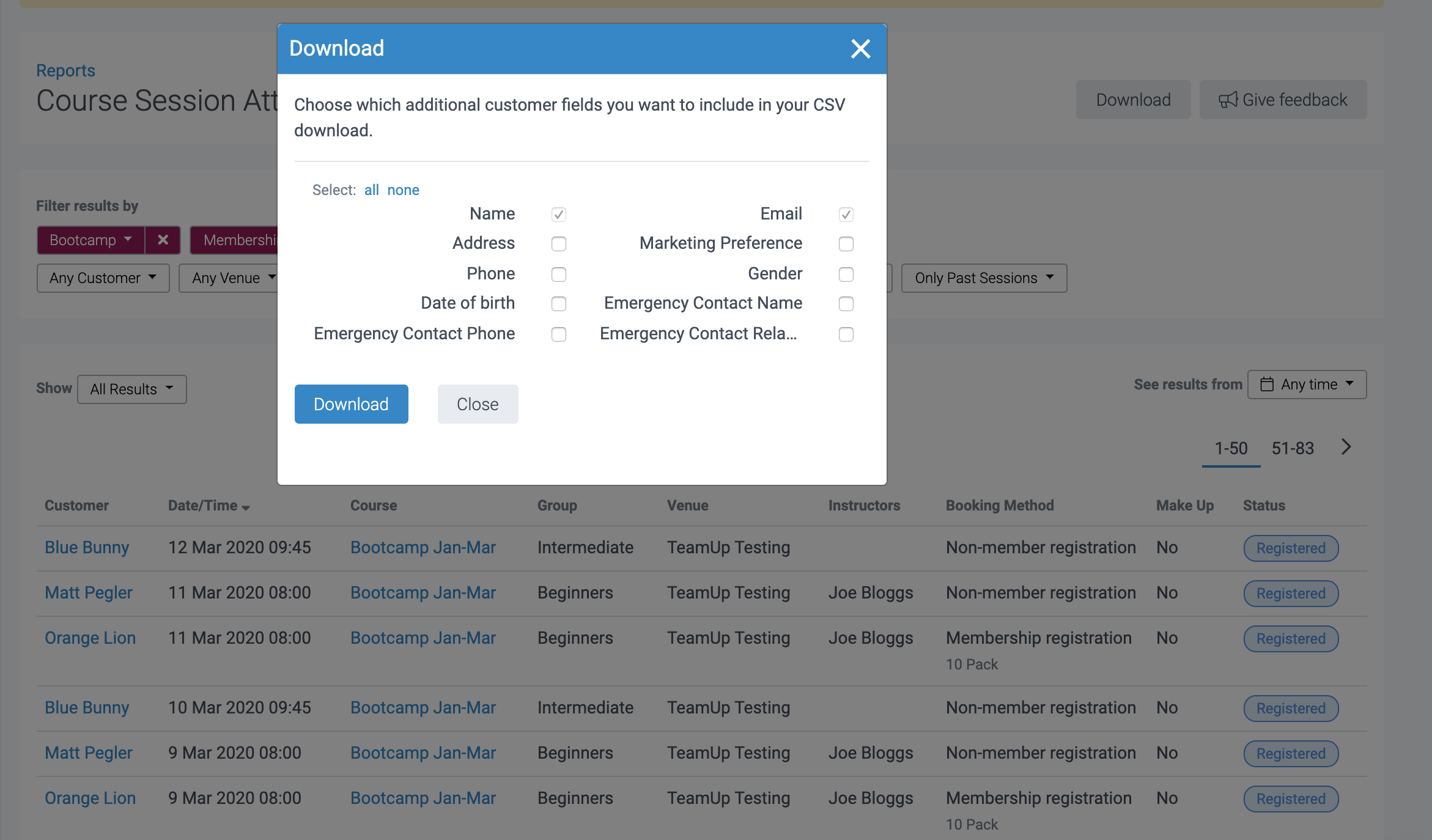 The attendance download report lets you export all of your course session attendances to a .CSV file.