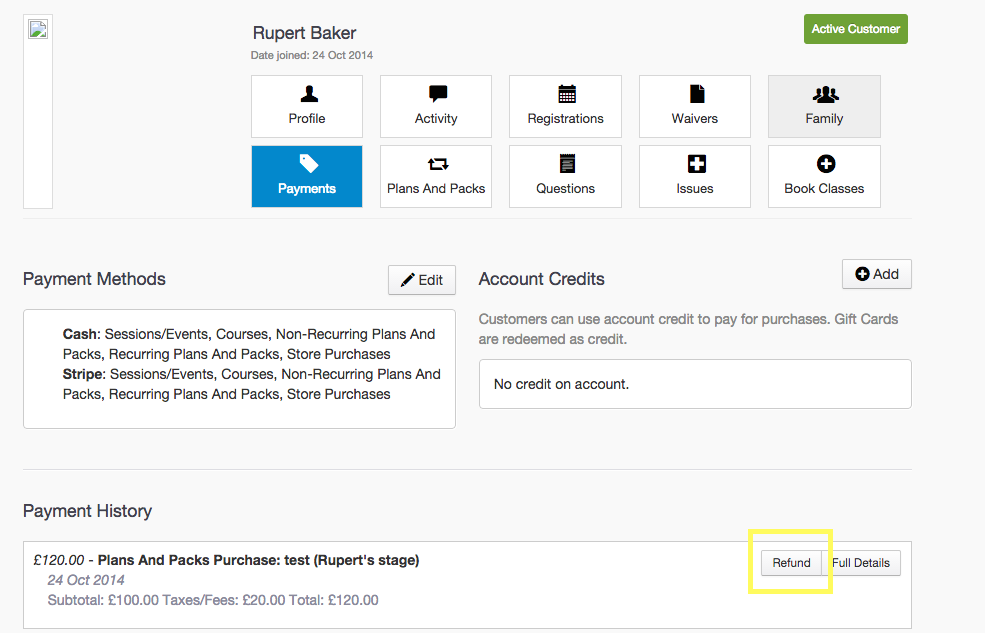 Navigate your way to the customer's profile page you would like to make the partial refund to, and click refund: