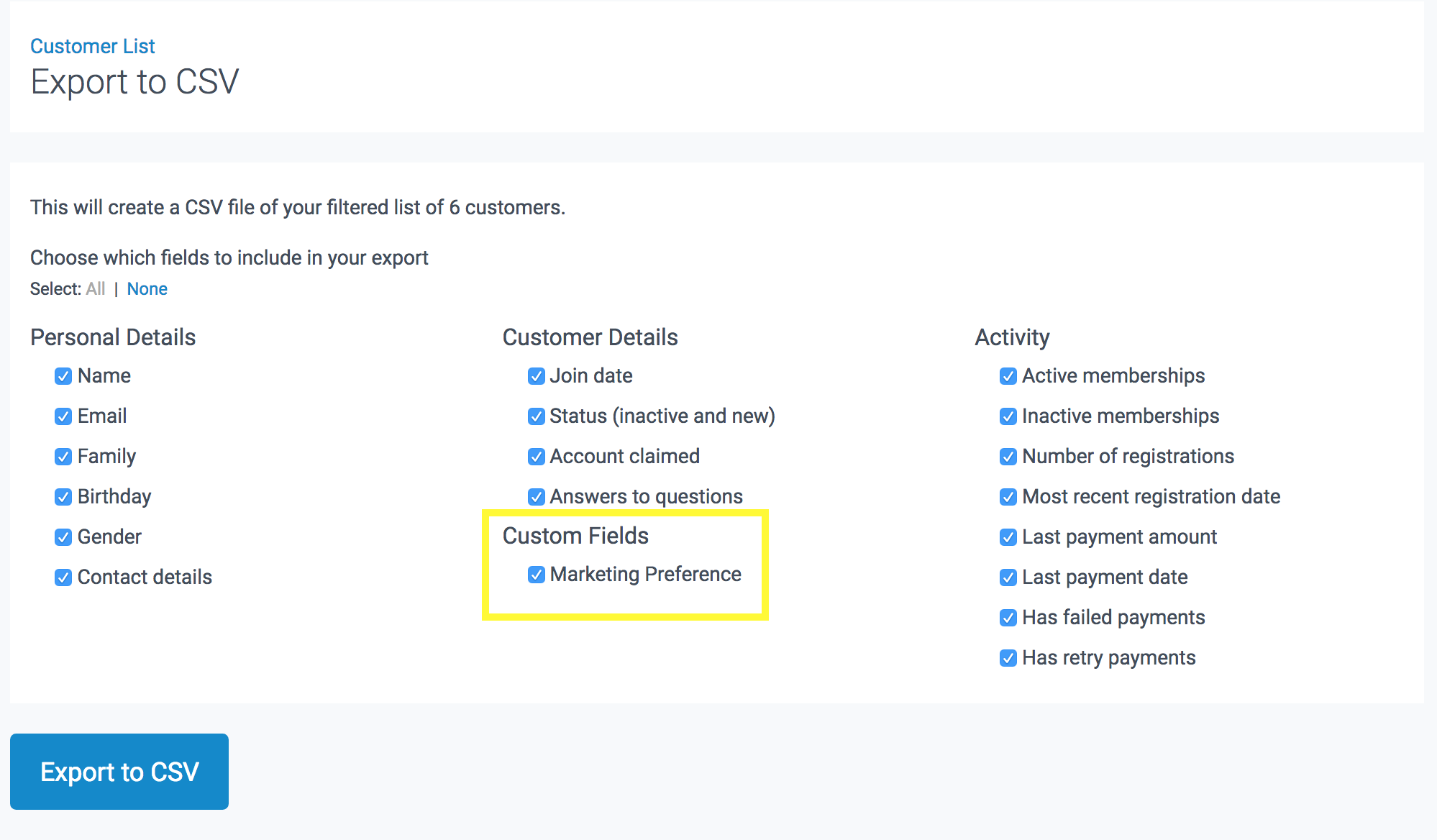 There are a couple of ways to export your marketing preference alongside customer contact information.