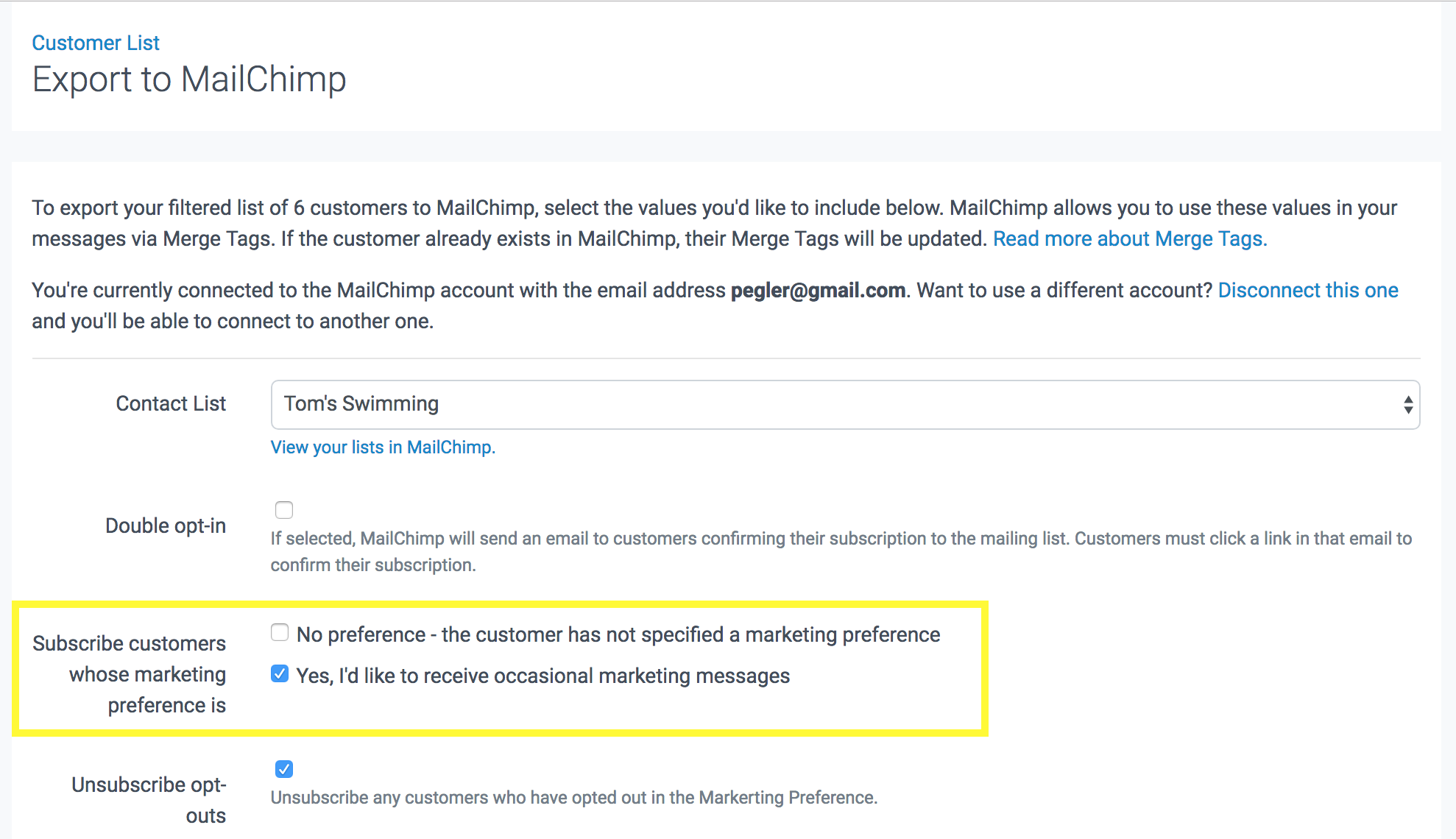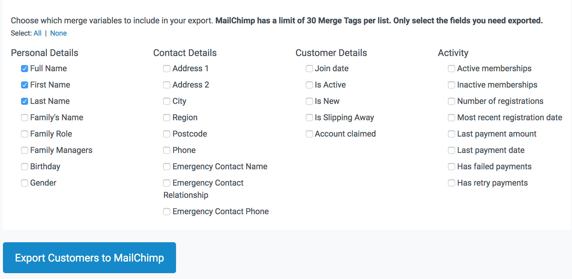 Now choose the fields you would like to export along with your marketing preference above, and 'Export Customers to MailChimp' when you're ready.