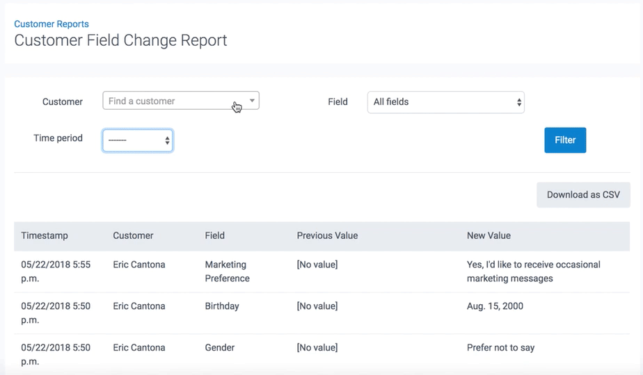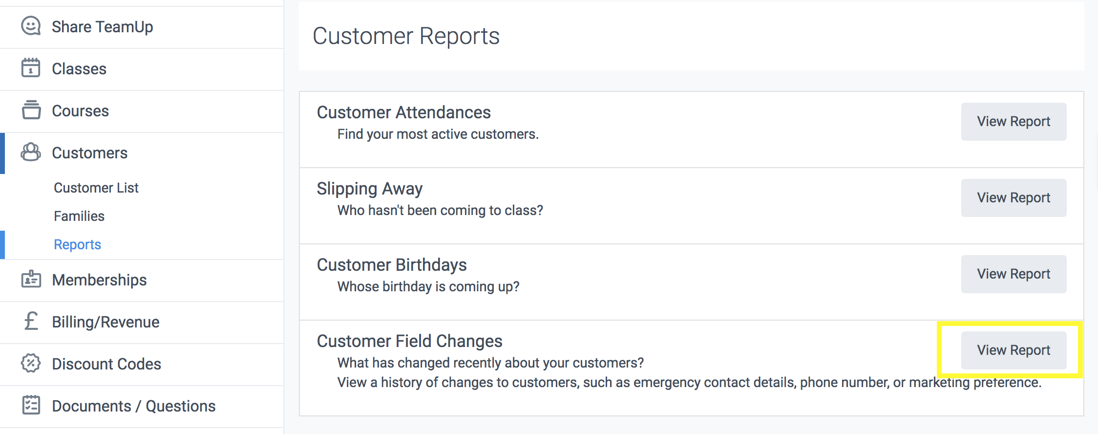 3. Export your Customer Field Change Report from Customers >> Reports >> Customer Field Changes
