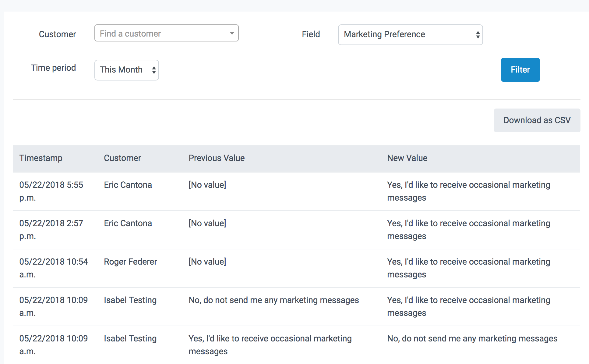 You'll be able to filter by customer name if required, select the desired field (in this case marketing preferences) and select a time period you want to see the changes.