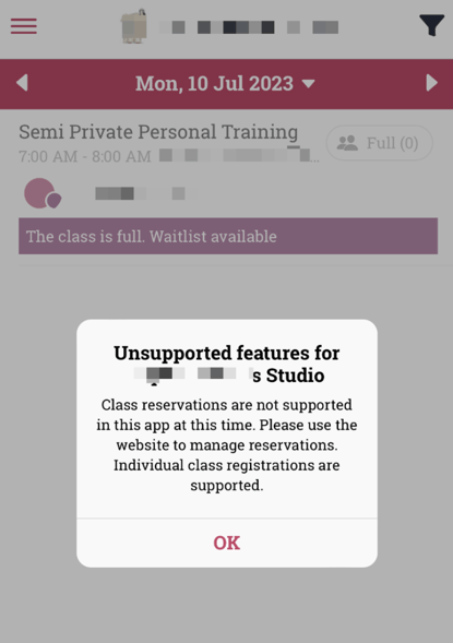 When a business offers recurring reservations, when first logging into your TeamUp App, you'll see a message letting you know that they are not supported in the app.
