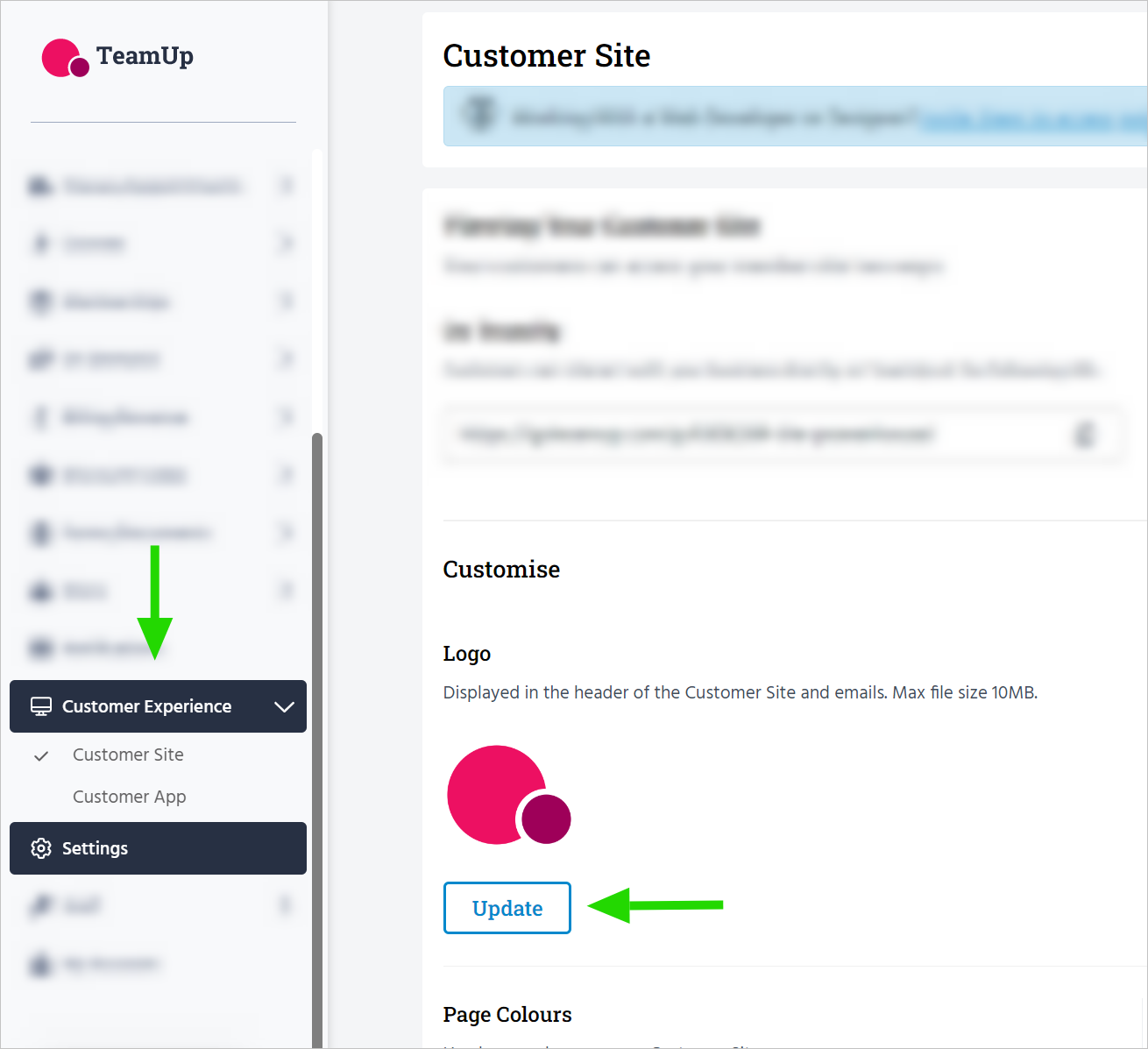 You can change your logo displayed on your customer site by going to Customer Experience ➔ Customer Site (here) and clicking on the "Update" button displayed under the Logo section.