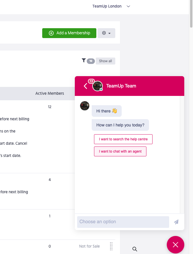 You can contact our support team at any time using the chat icon in the bottom right corner of your TeamUp account, or by emailing support@goteamup.com.From the chat widget, you can choose to search our help centre or chat with an agent.