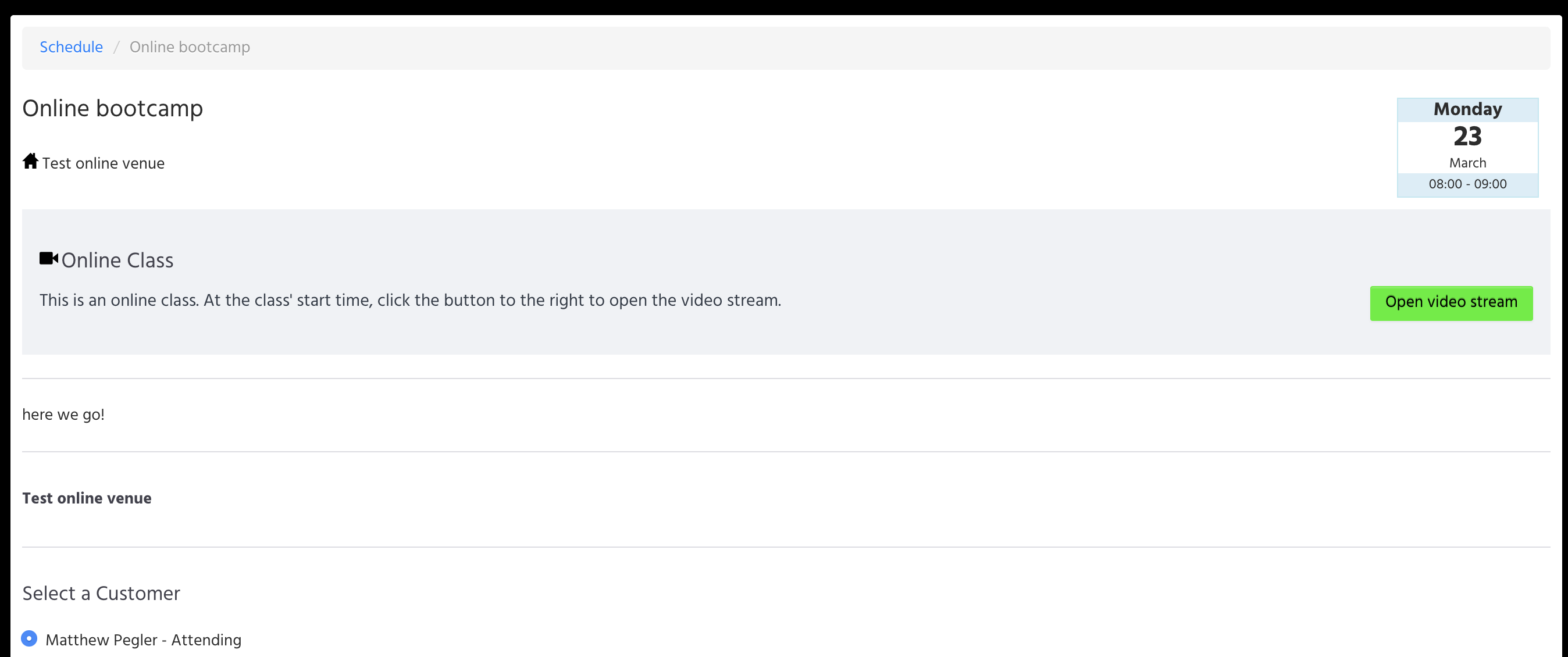 Alternatively, they can head to their TeamUp account and click on the class they've registered onto from the calendar. Please note that join links on the class detail page will only show to people who register (each customer has a unique link that becomes inactive if the customer leaves the class). They'll have an option to open the video stream from there: