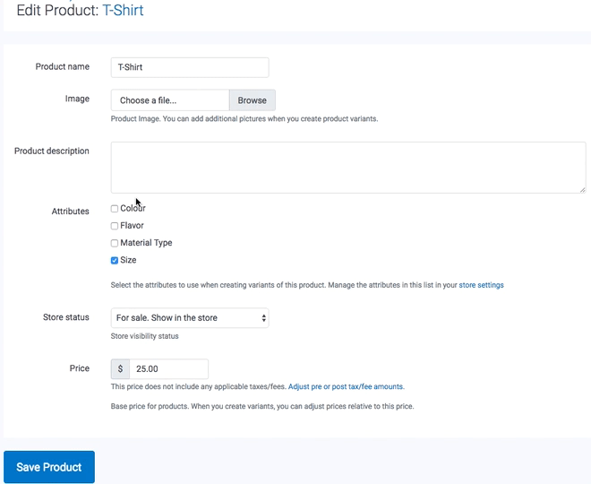 You can then set the desired attributes for this product. For this T-Shirt we're selecting colour and size.