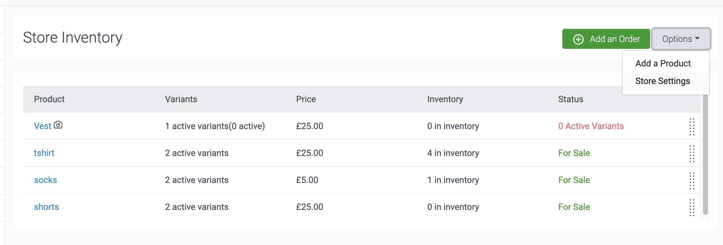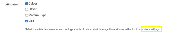 IMPORTANT. First make sure you have your desired attributes added i.e. size, colour, material, sex. Head to Options>>Store Settings to add these.