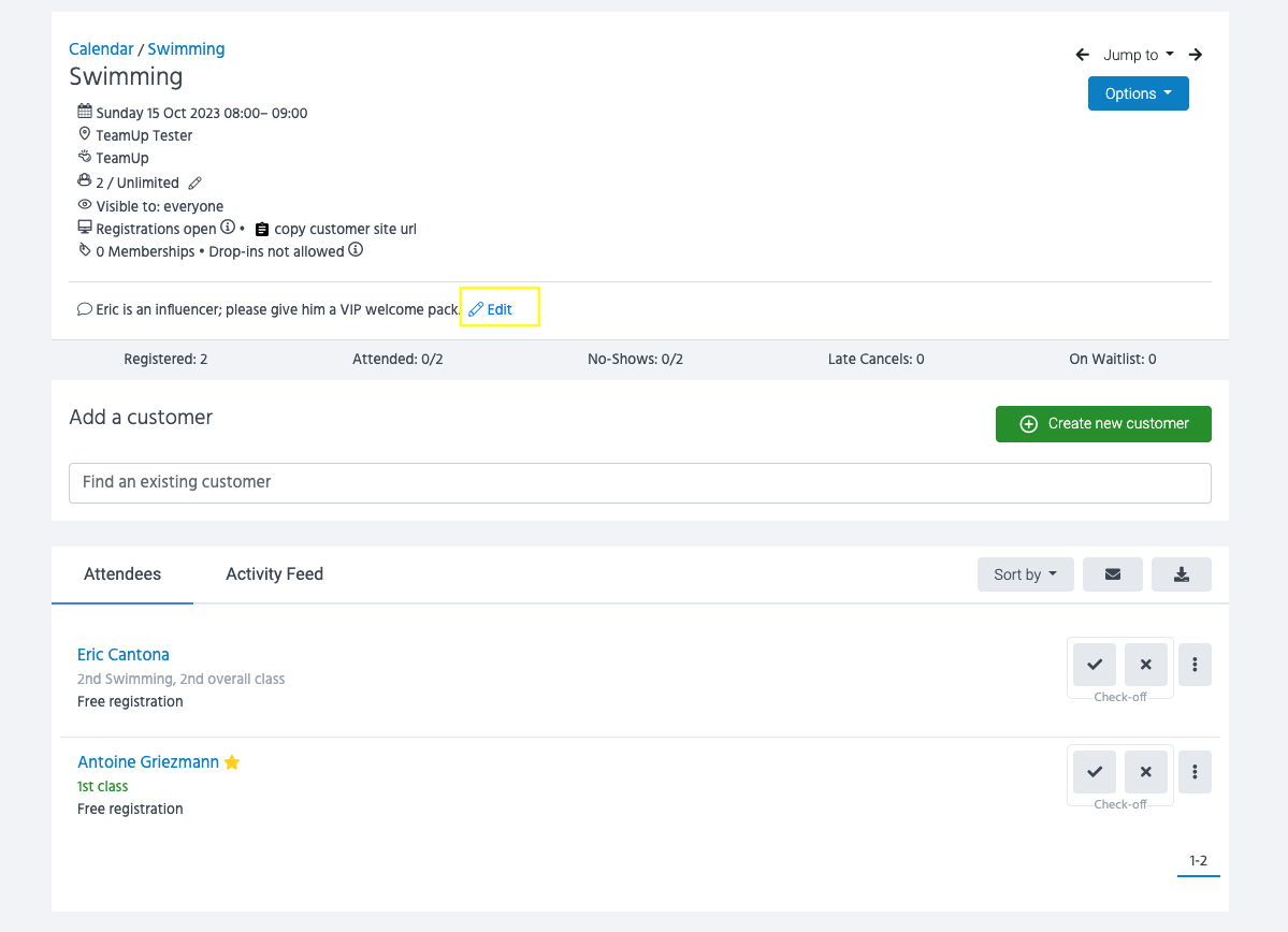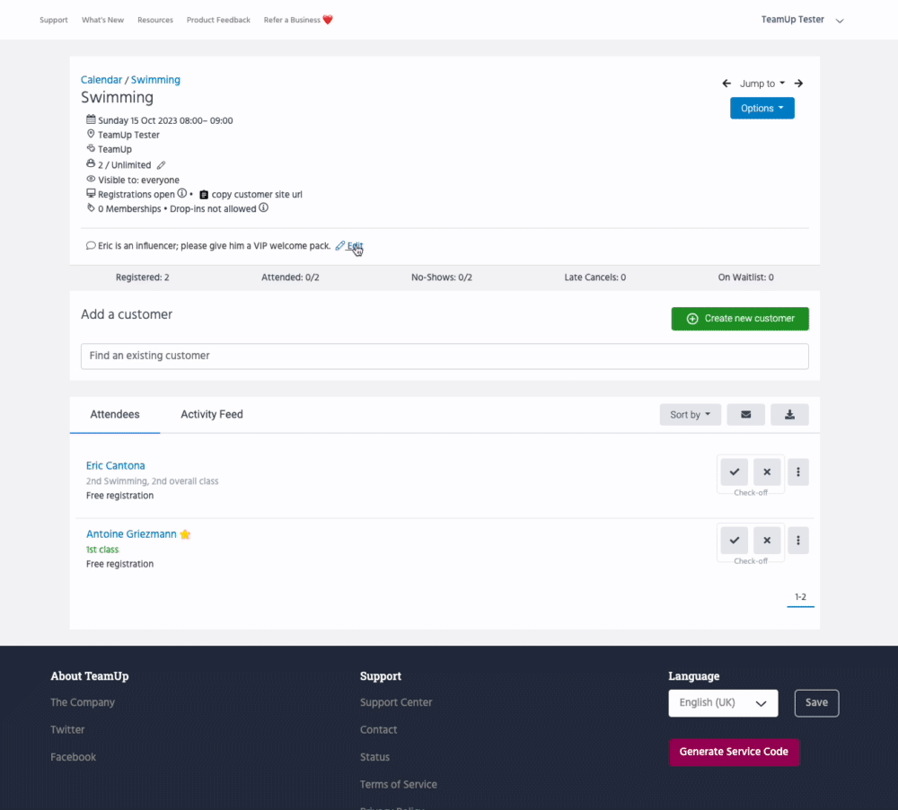 📝 It is also possible to attach internal notes to a specific customer. This is useful when there's important information your staff members need to know about the customer (for example, an injury or a health condition). Notes added to the customer profile will appear under their name on any events they book. To learn more about this feature, click here.