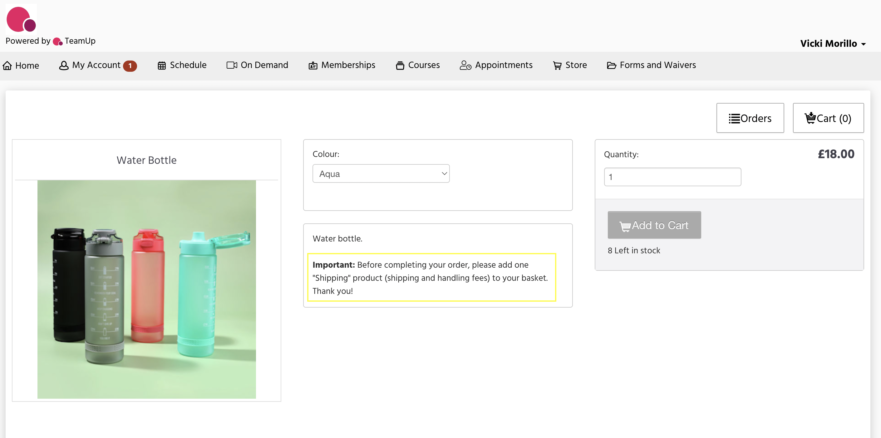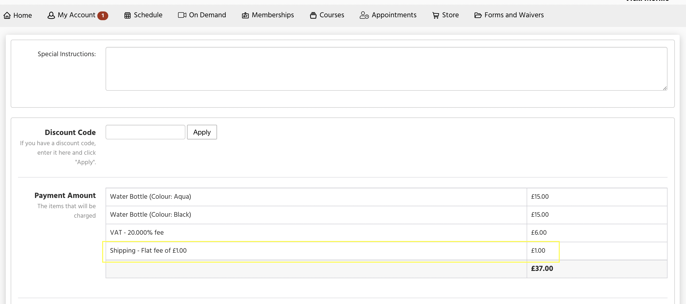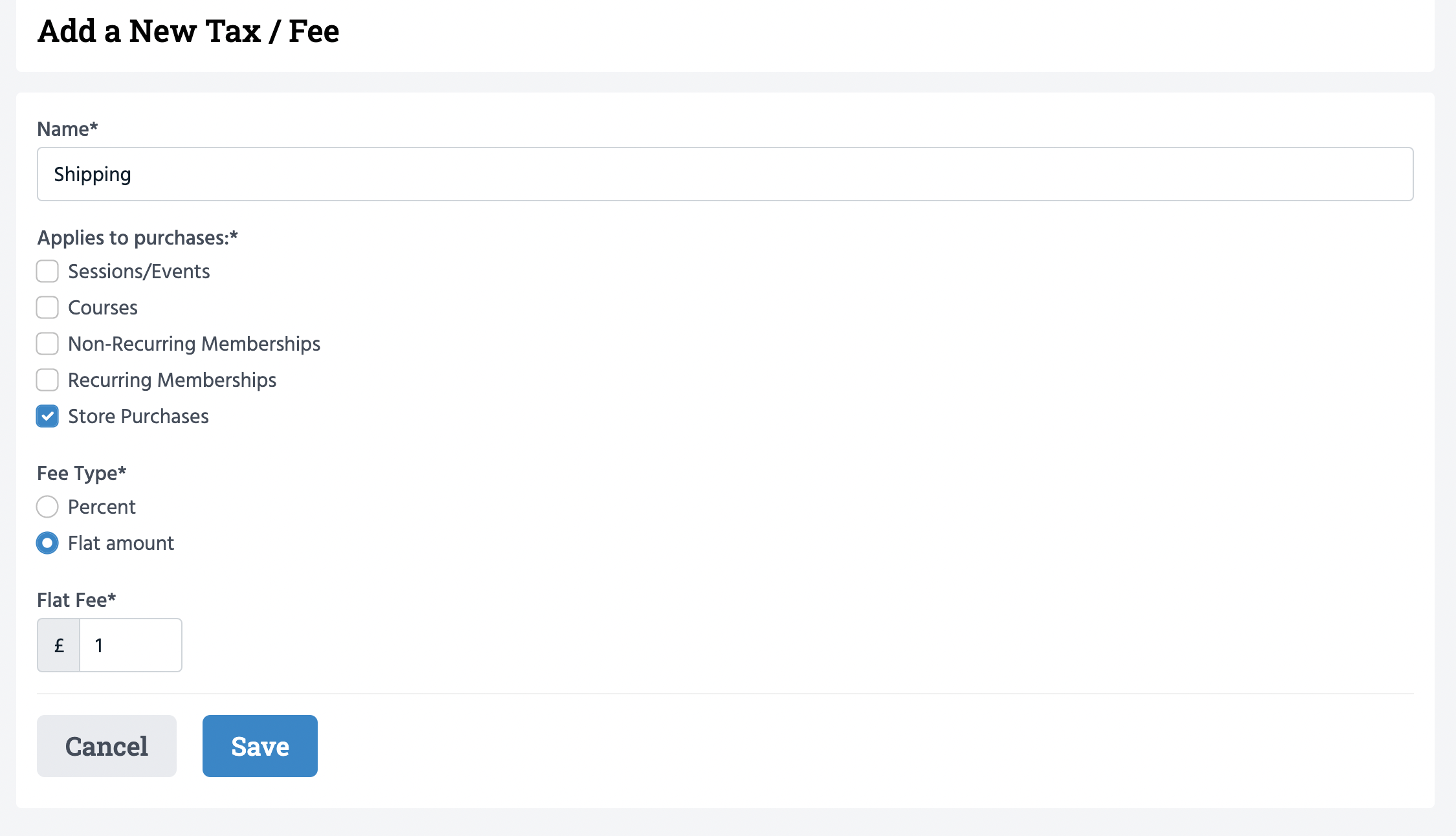 - Add a shipping fee. From the Taxes and Fees section in TeamUp (Settings >> Payment), you can create different types of fees that apply to each purchase type, so you can set up a "shipping" fee that applies to store purchases only (important: this fee will apply once per order). To set up a shipping fee, please see Creating taxes and fees.