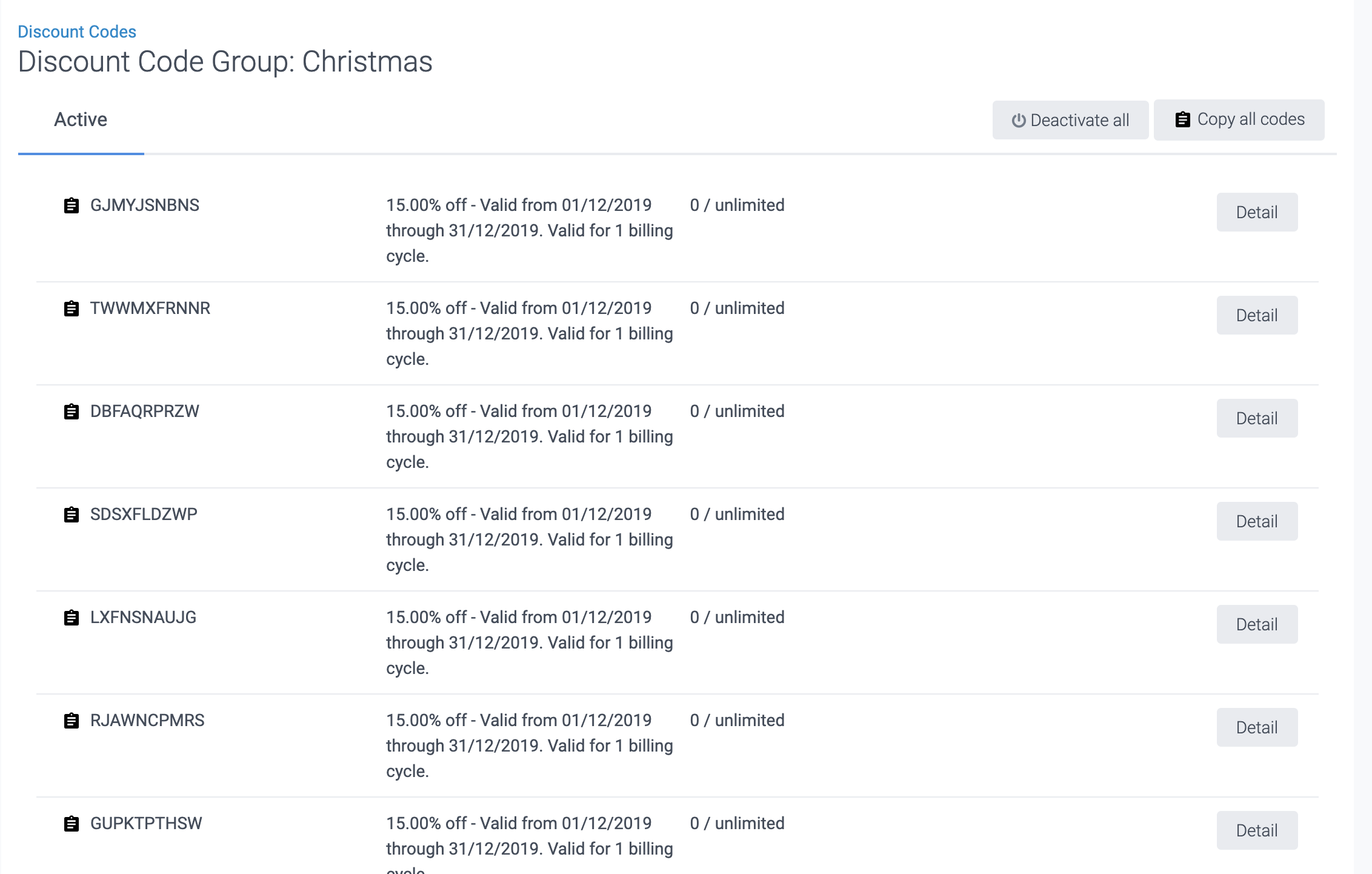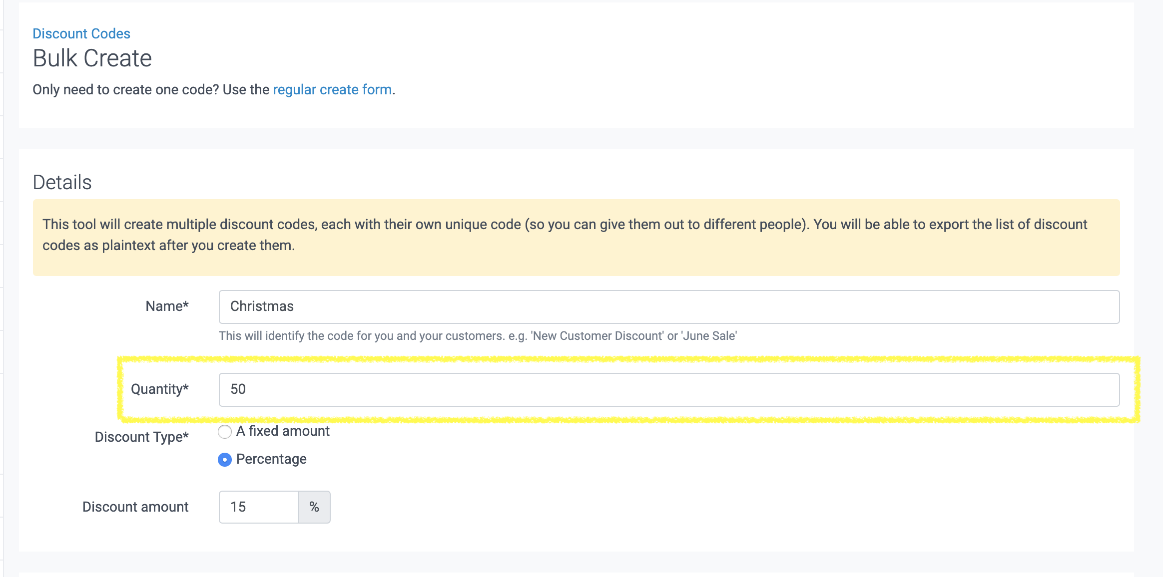 For example, you might want to print out vouchers that your customers can purchase and gift. You can use the bulk-create tool to create a batch of codes and download them.