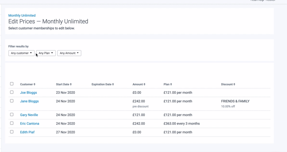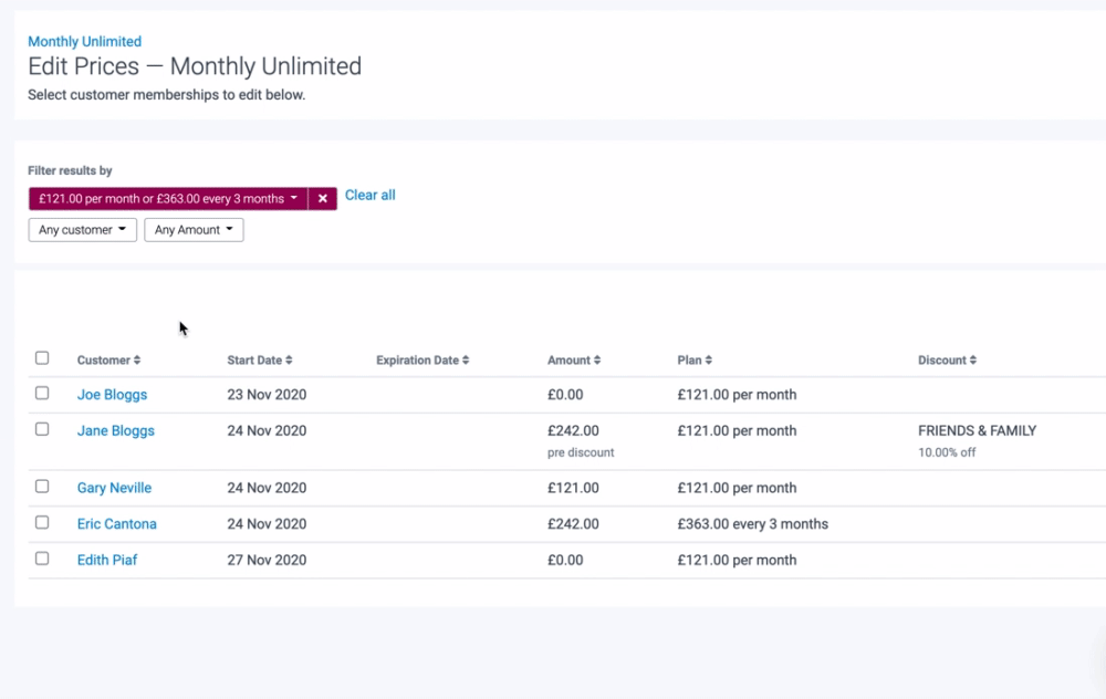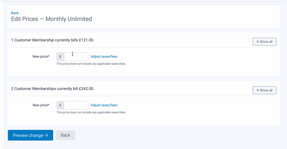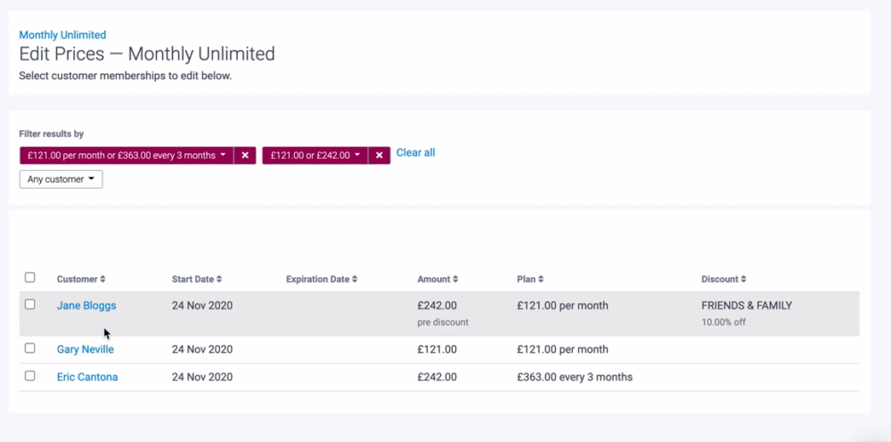 You can easily update your members' fees in bulk from the Memberships section. The bulk edit tool within each membership allows you to apply the same price to all or some of your customers.