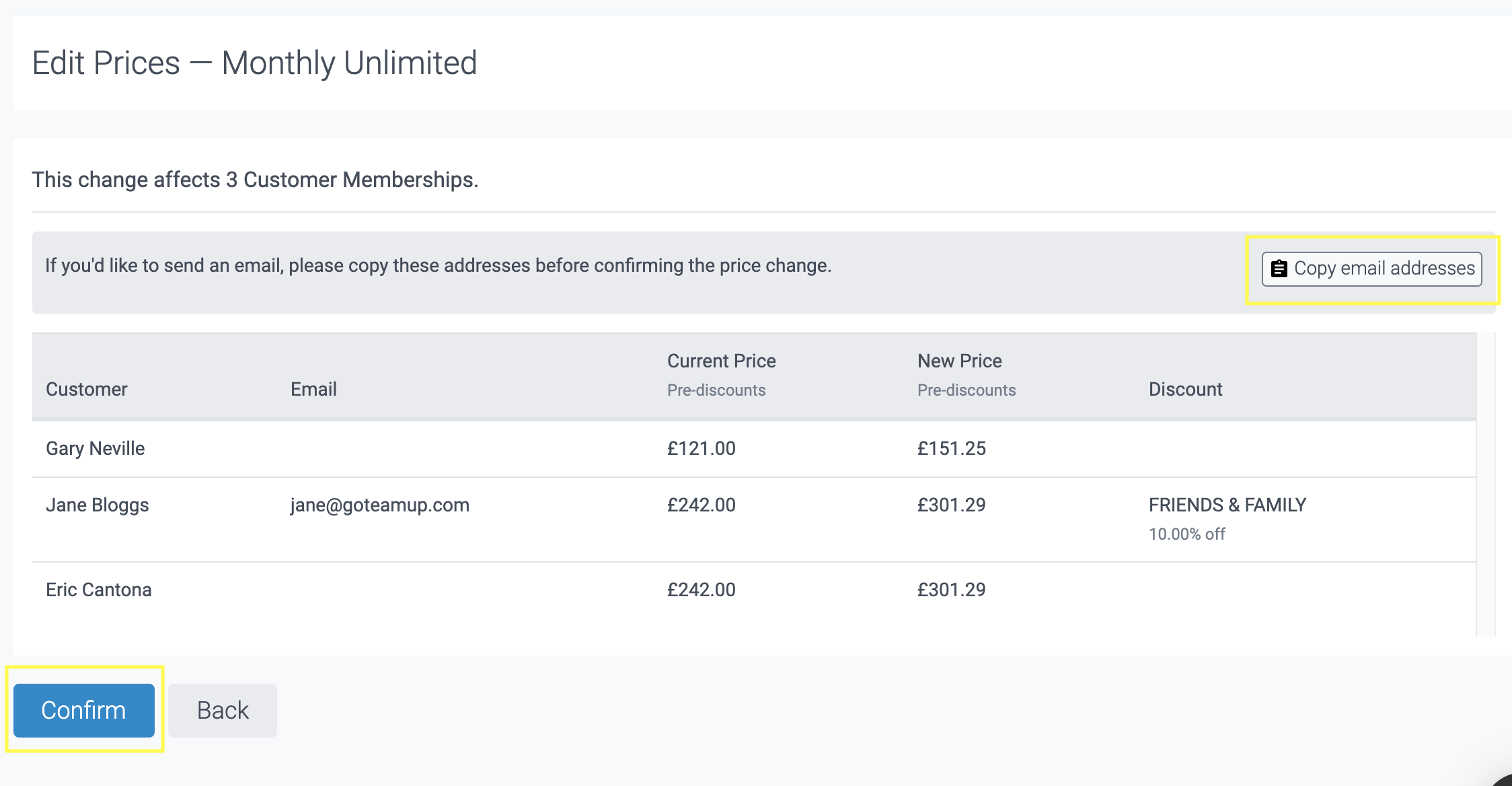 In the final step, you'll see a preview of the changes being made. Customers aren't notified of this change automatically, so if you'd like to email them, you can copy their emails by clicking the 'Copy email addresses' button and pasting them into your preferred email software.