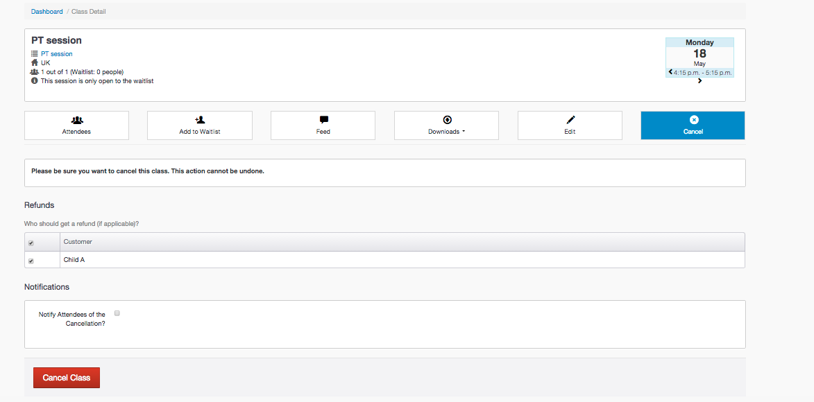 From the subsequent page, you have the option to refund the customer, and notify the customer/s of the cancellation. Once you have made your choices, you can click to cancel the class.