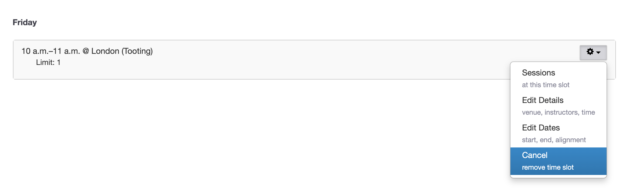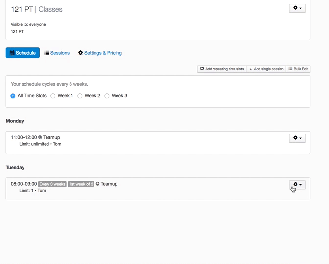 Repeat this process for any classes with attendances. Once complete, click the gear icon beside the timeslot you would like to remove, and click 'Delete'.