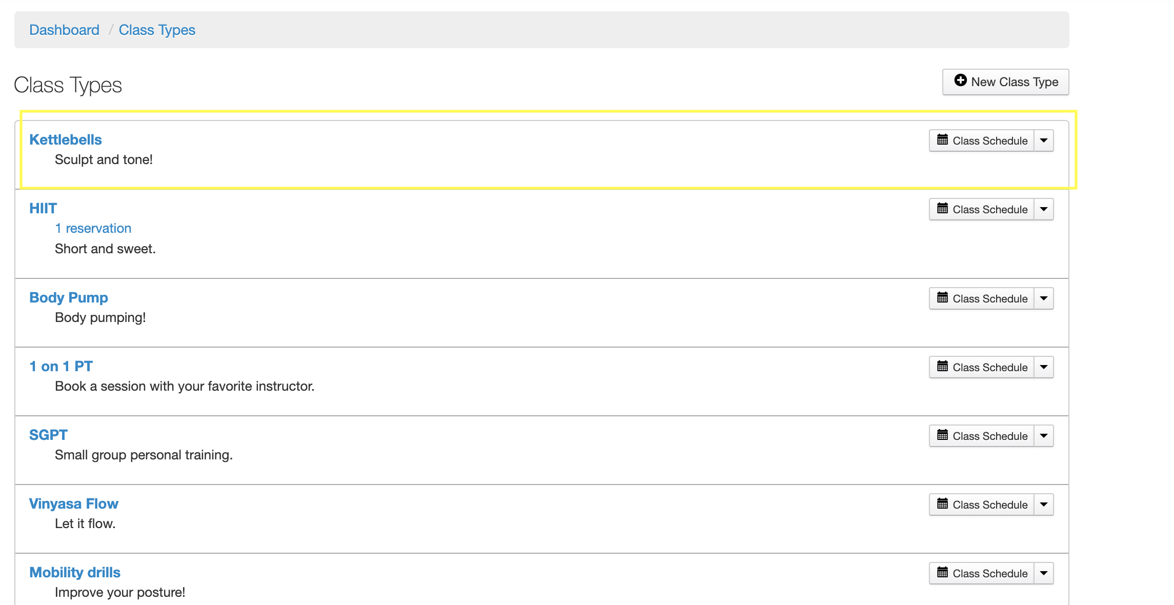 Navigate your way to Classes/Appointments >> Class Types >> and select your desired class.