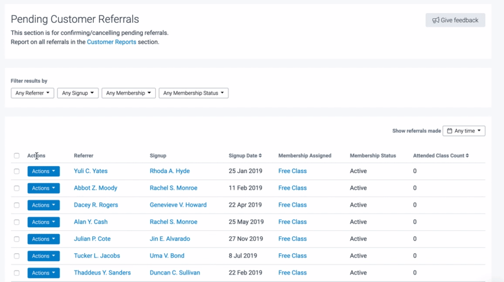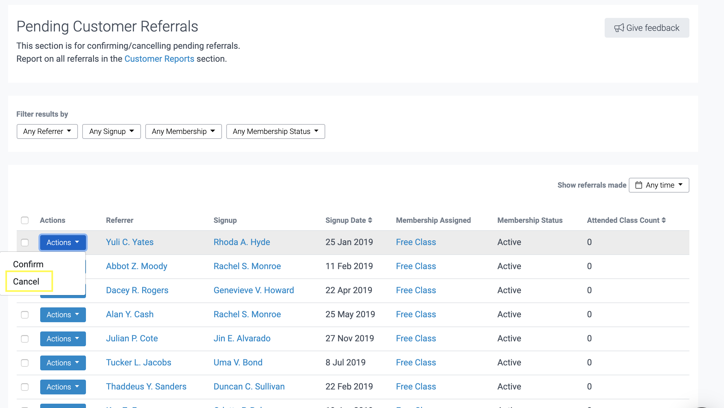 To cancel a referral, click the 'Actions' button next to the customer's name and then 'Cancel'.