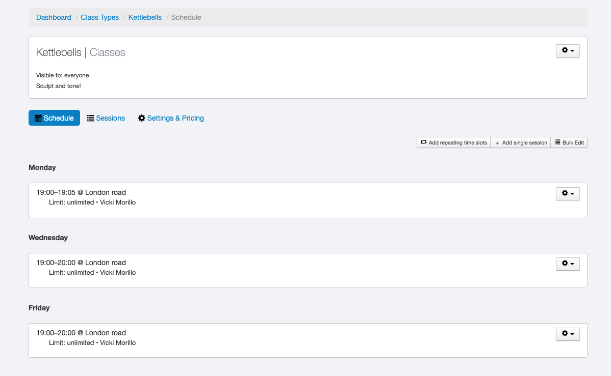 In the example below, you wouldn't be able to name the Monday slot something else - you would have to cancel this slot, create a new Class Type with the desired name and add a Monday 19:00 slot to it.