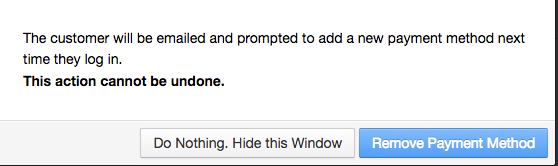 If removing the payment method, a pop-up will let you know that an email will be sent to the customer asking them to provide new payment details for the membership.