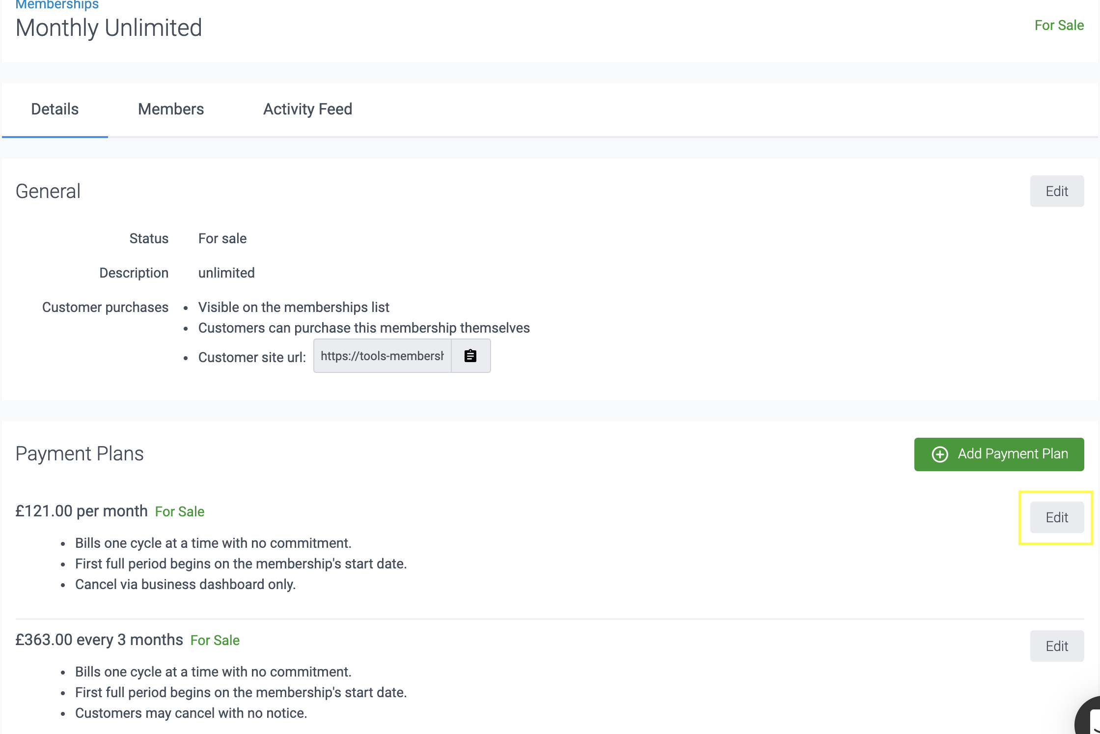 On the next page, within the Payments Plans section, you'll be given the option to add a new payment plan or edit an existing payment plan. To change the pricing click the 'Edit' button for the relevant pricing plan.