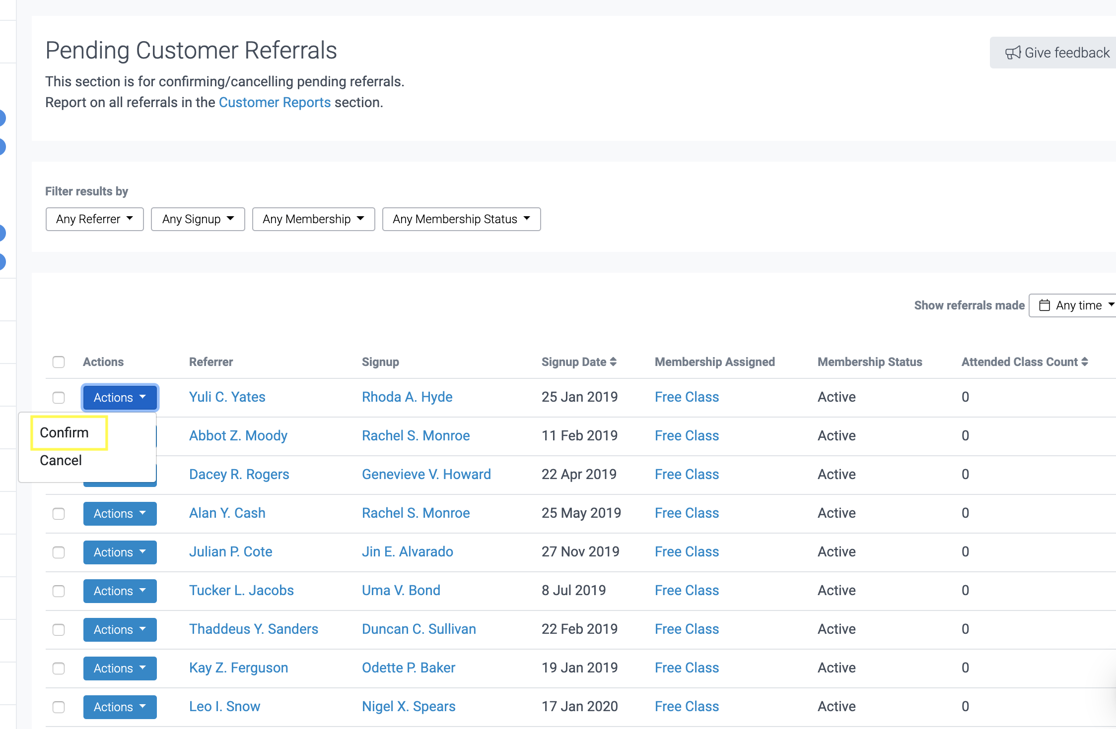 To confirm a single referral, click the 'Actions' button next to the customer name and click 'Confirm'.