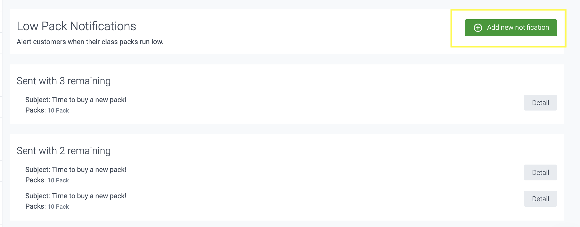 Want to see what your email looks like when a customer receives it? Head to Notifications >> Memberships >> Low Pack Notifications >> click 'Detail' next to the notification.