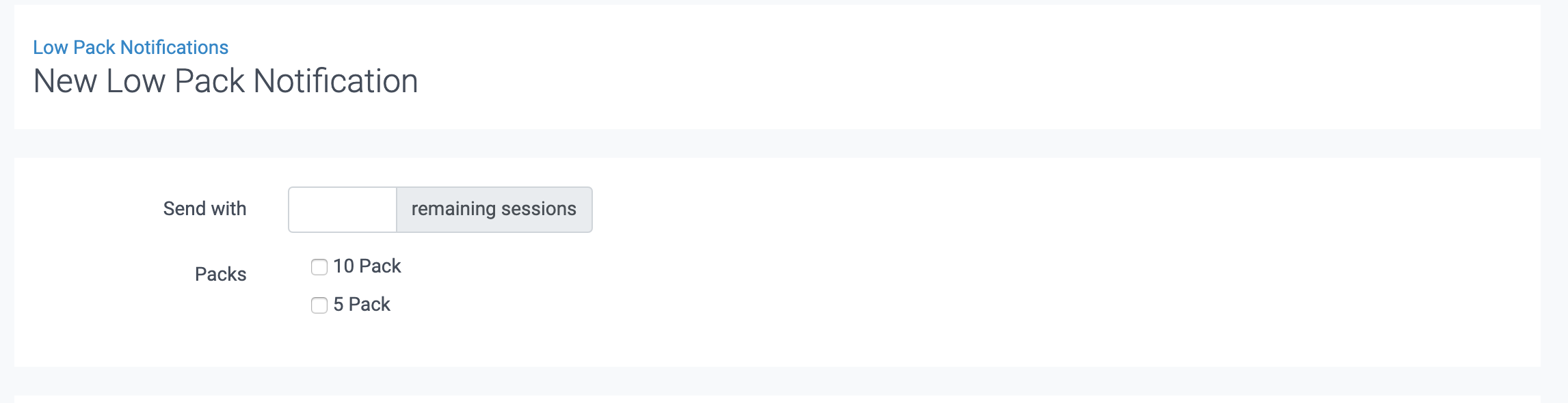 Tip: you can add as many Pack Running Low Notifications as you need. For example, if you have packs with different sizes, as seen in the example below, you might create a Pack Running Low Notification that triggers when they have 2 sessions left for the 10 Pack, and another notification that gets triggered when customers have 1 session left on the 5 Pack.