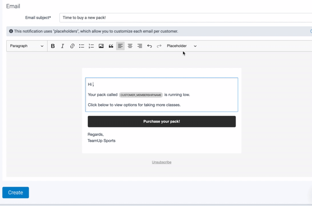 When creating and editing emails, placeholders can be selected from a dropdown. Placeholders allow you to insert variables into the content.