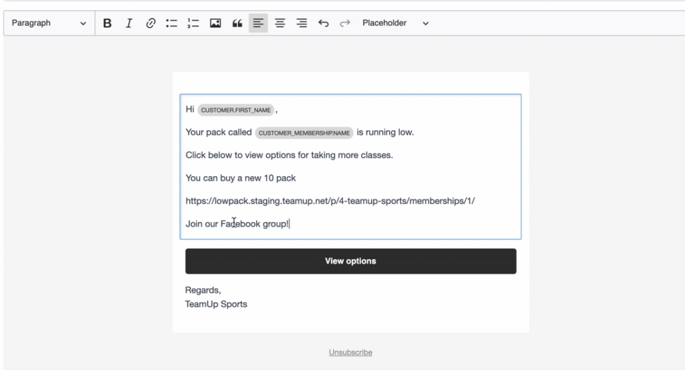 For example, you might want to personalise the email with the customer's name. You would select the customer_first_name placeholder, as seen in the example below.