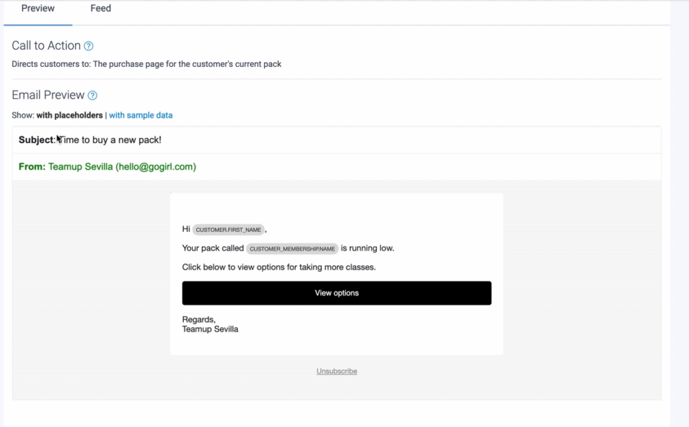 Here, you can preview your email with placeholders, or see how it will look with the placeholders replaced by the customer's information: