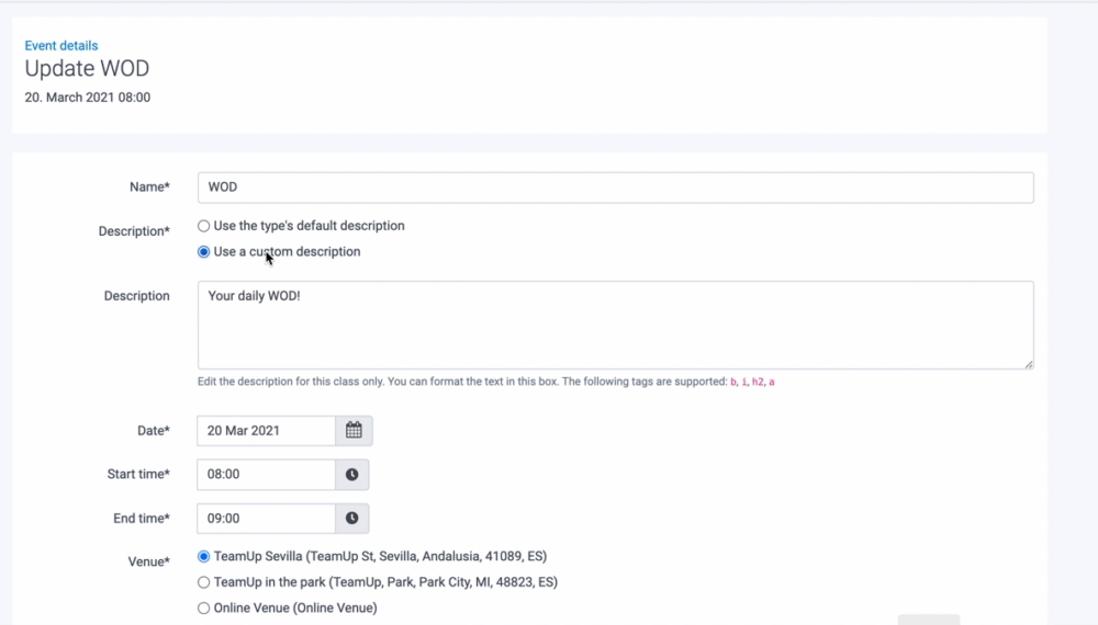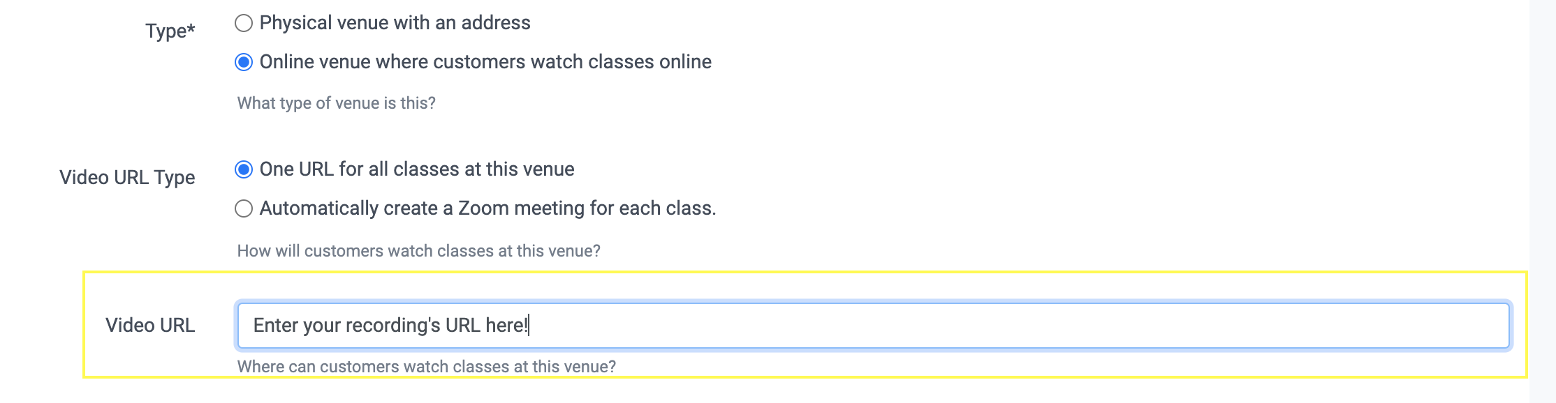 Using an online venue. For this option, you'll need to create an online venue with one URL for all classes at this venue, as seen below. If the link to each recording is different, you'll need to edit the Video URL field before each class.