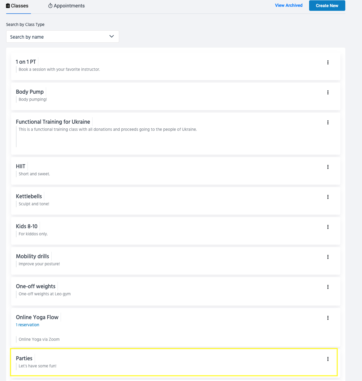 - Create a Class Type. To schedule the event, first, you'll need a Class Type. This could be an existing Class Type or a new one you create for the event. See this guide if you need help creating a Class Type. For example, if you host seasonal parties, you might create a class type called 'Parties'.