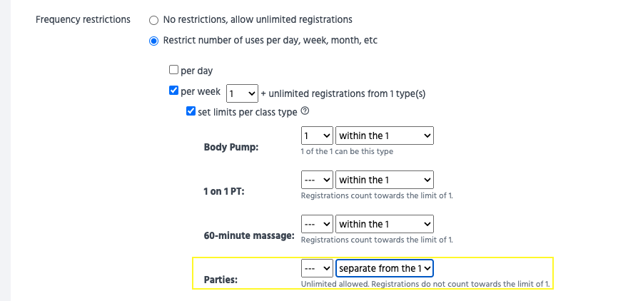 To do this, head to Memberships >> Memberships >> click the membership name >> click 'Edit' next to Usability >> select the event Class Type >> under 'Frequency Restrictions', make the event "separate from", as seen below: