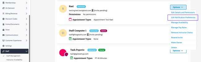 If you need to adjust or update the notification preferences for a member of staff, this can be done via Staff >> Staff Management, select Options by the specific staff member >> Edit notification preferences.
