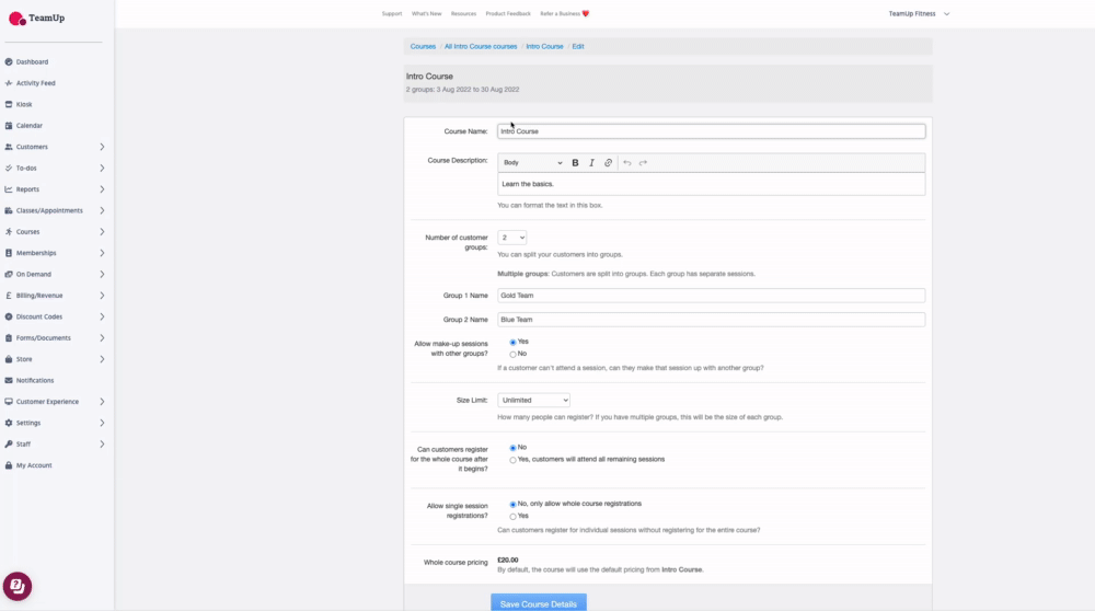 To edit a course, head to Courses >> Courses >> click the course you want to edit >> click 'Edit' >> change as needed, and click 'Save Course Details'.
