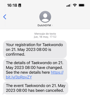 - Waitlists, registration confirmations, and event reminders. These SMS messages deploy automatically when there's a change in a waitlist, a customer signs up for a class or appointment, or it's three hours before the event starts. They don't require any action on your part.
