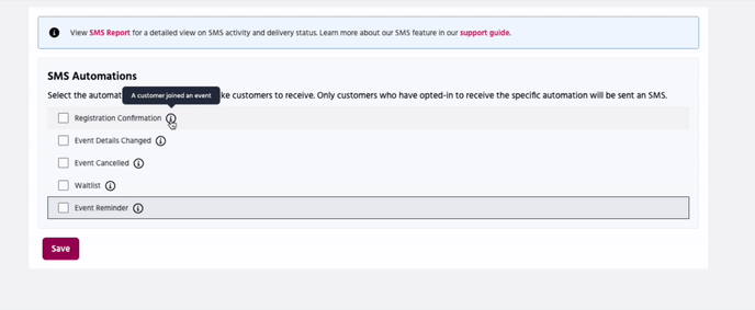 To configure the SMS types, head to Communications >> SMS. Here, select the types you wish to enable and click 'Save'. For more information about each notification, hover over the 'i' icon, as seen below.