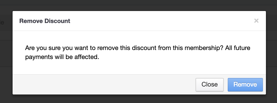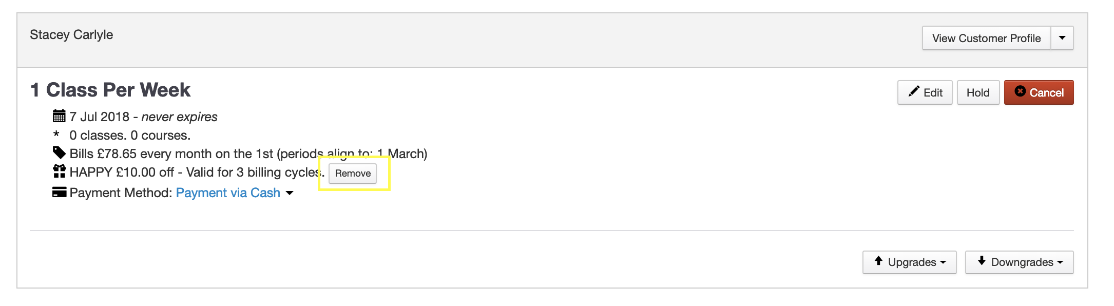 The discount has now been removed from the customer's membership and all future payments. Review this under the "Upcoming Payments" tab.