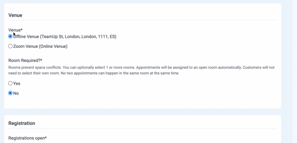 Venue. Here you'll be prompted to select a venue. Appointments work with online venues and offline venues.