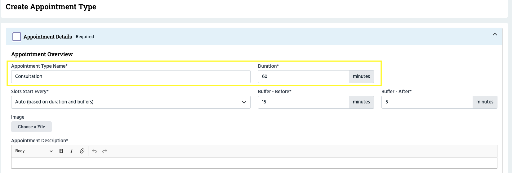 Duration. This is the length of the appointment. If you offer shorter or longer appointments of the same type, you'll need to create a separate Appointment Type for each one. For example, a 30-minute massage would be an Appointment Type and a 60-minute massage would be a separate Appointment Type.