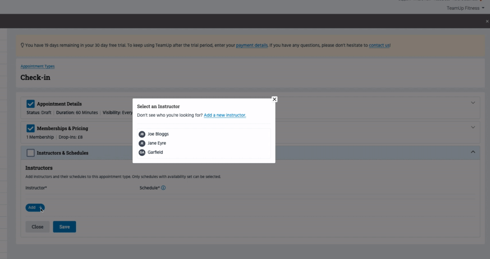 In this section, you'll be prompted to add the instructor or instructors that are available for this Appointment Type.