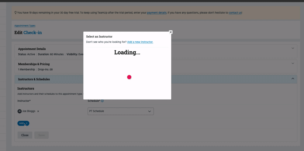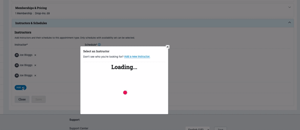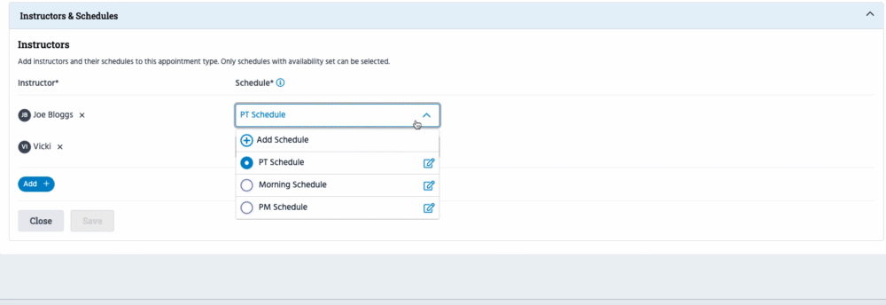 To add an existing instructor whose schedule has already been created, click 'Add +' and select the instructor from the popup. Once selected, you'll be prompted to choose which schedule - if they have multiple - you want to link to this Appointment Type.
