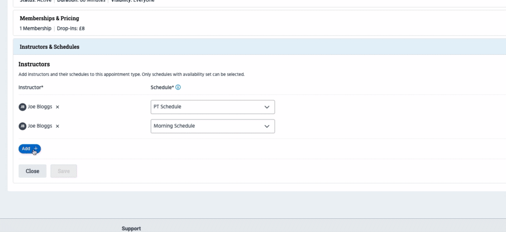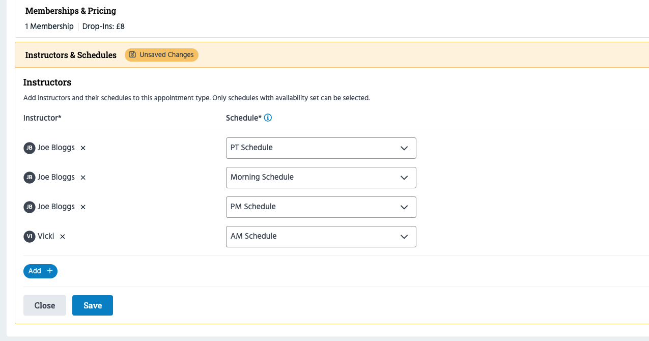 Click 'Save' to finalise, or click 'Add +' to continue adding instructors/schedules.