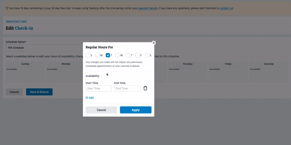 Important! Please note that any changes made to this schedule will also apply to any other Appointment Types this schedule is linked to. If you need to create a NEW schedule for the instructor, please see below: 'Add an existing instructor, and create a new schedule for them'