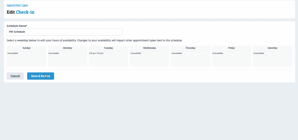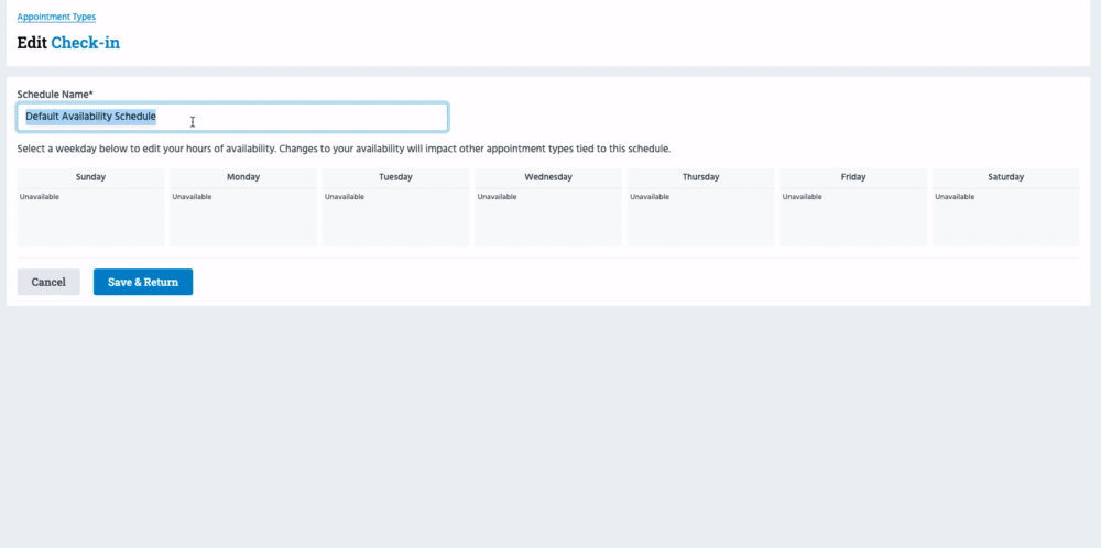 On the next page, you'll be prompted to create the instructor's availability schedule. By default, it's named 'Default Availability Schedule', but you can change it to whatever you want. Once you've added the schedule, click 'Save & Return', and the instructor/schedule will be linked to the Appointment Type.