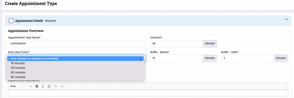 *Note. If both buffers are left as "0", the 'Slots start every' setting will apply. If 'Slots start every' and both buffers are set to "0", appointments will be back to back.