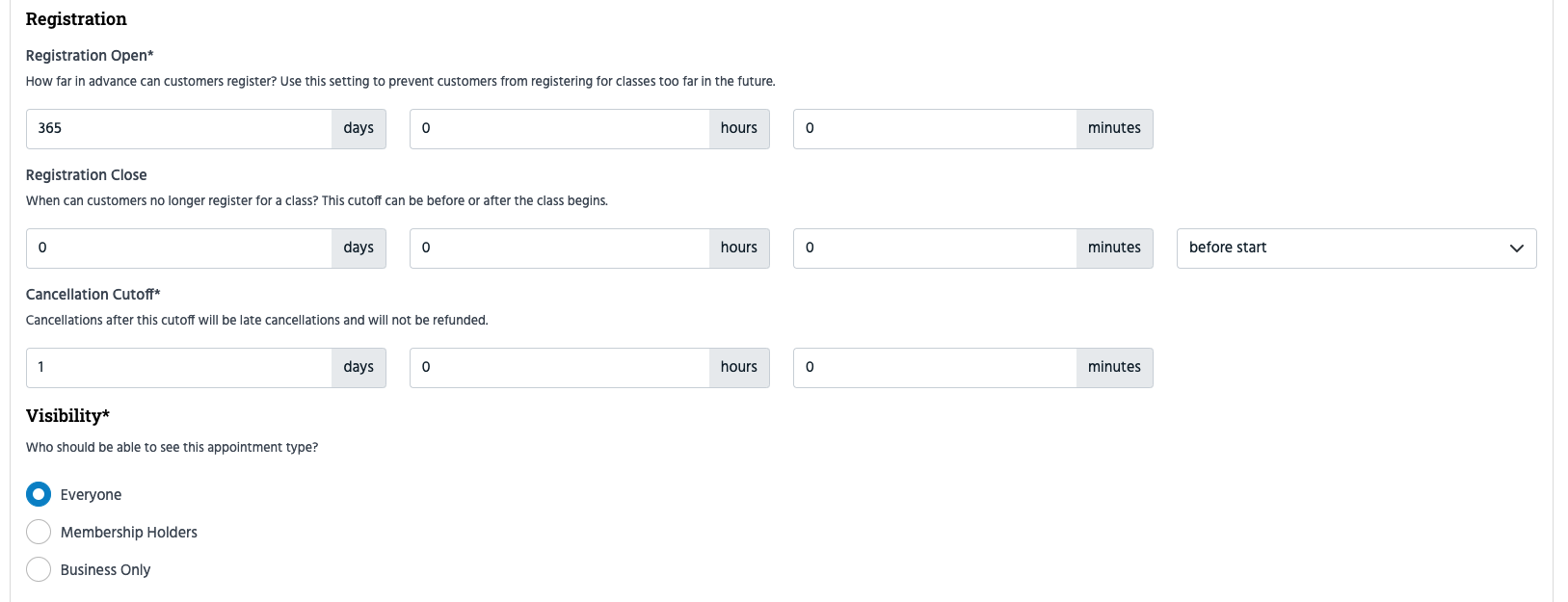 Registration. These settings determine when customers can register and leave. You'll be prompted to create a new registration timeline each time you create a new Appointment Type.