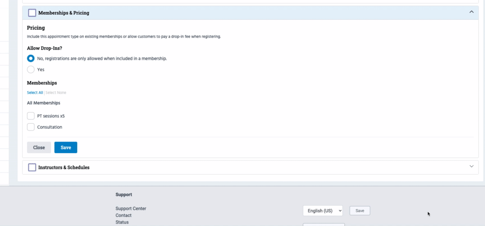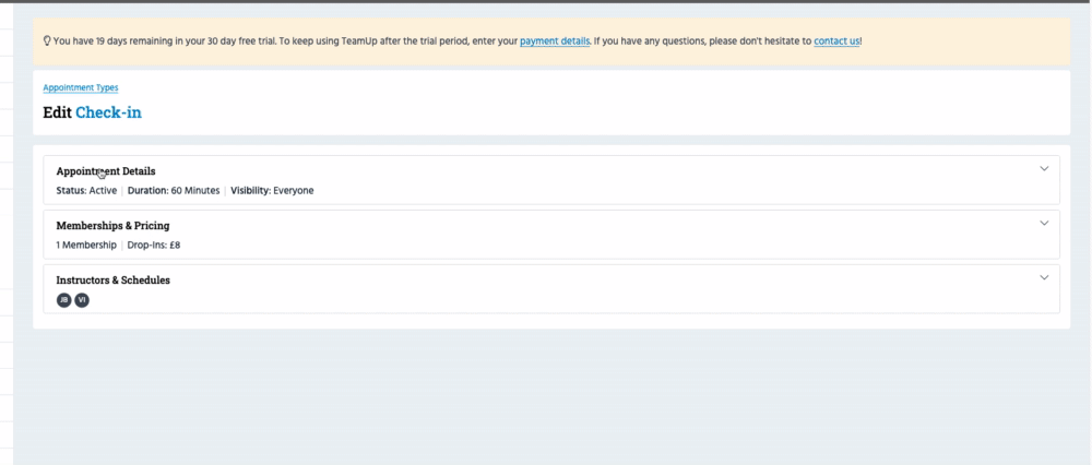 In the next step, you'll see an accordion-style form with three sections that you'll need to complete (Appointment Details, Pricing & Memberships, and Instructors & Schedules).